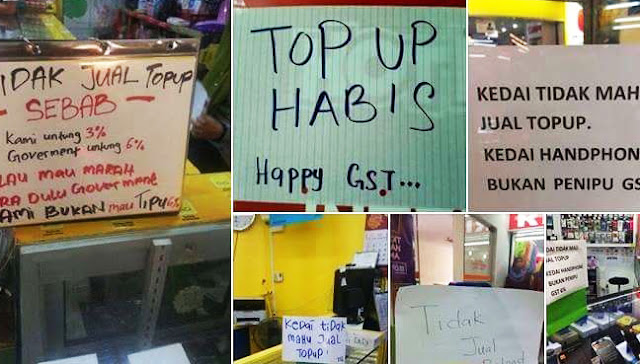 Bos Lisa dah bagitau awal-awal memang 1 November nanti tak payah jual topup. Sebab tak tau betul ada gst atau dah tiada gst . Beli reload tu pun dah kena gst , tak kan nk jual tak ada gst. rugi disitu . Atau mungkin habiskan topup yang dah termasuk dalam gst baru jual yang NEW reload tanpa gst. FAIR , macam dulu-dulu.. topup yang beli takda gst tak boleh jual harga gst . Untuk postpaid pula memang tiada kelainan harga la . Sebelum ini kan memang dah ada yang 6% tu tapi namanya bukan gst , gov. tax 6 % . Just tukar kepada nama GST je . Tiada harapan nak berkurang lah ye untuk pengguna talian pasca bayar. Tapi dulu untuk bill broadband atau internet memang takada Gov. Tax . Charge untuk panggilan keluar saja ayng kena GST . HUHU sekarang baik panggilan atau internet dua-dua kena 6 % .